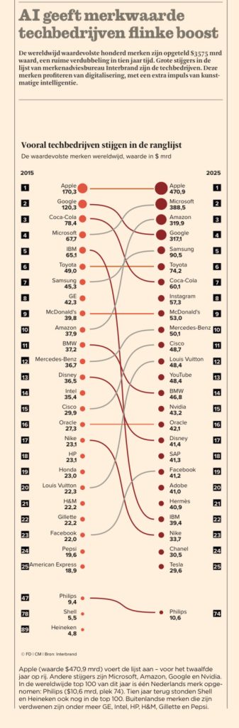 Inspiratie: onderzoek Interbrand. Uit het onderzoek blijkt dat Apple, Microsoft, Amazon, Google en Samsung Electronics de meest waardevolle bedrijven ter wereld zijn. Techbedrijven profiteren van digitalisering en krijgen boost door ai. Het onderzoek vind je HIER.